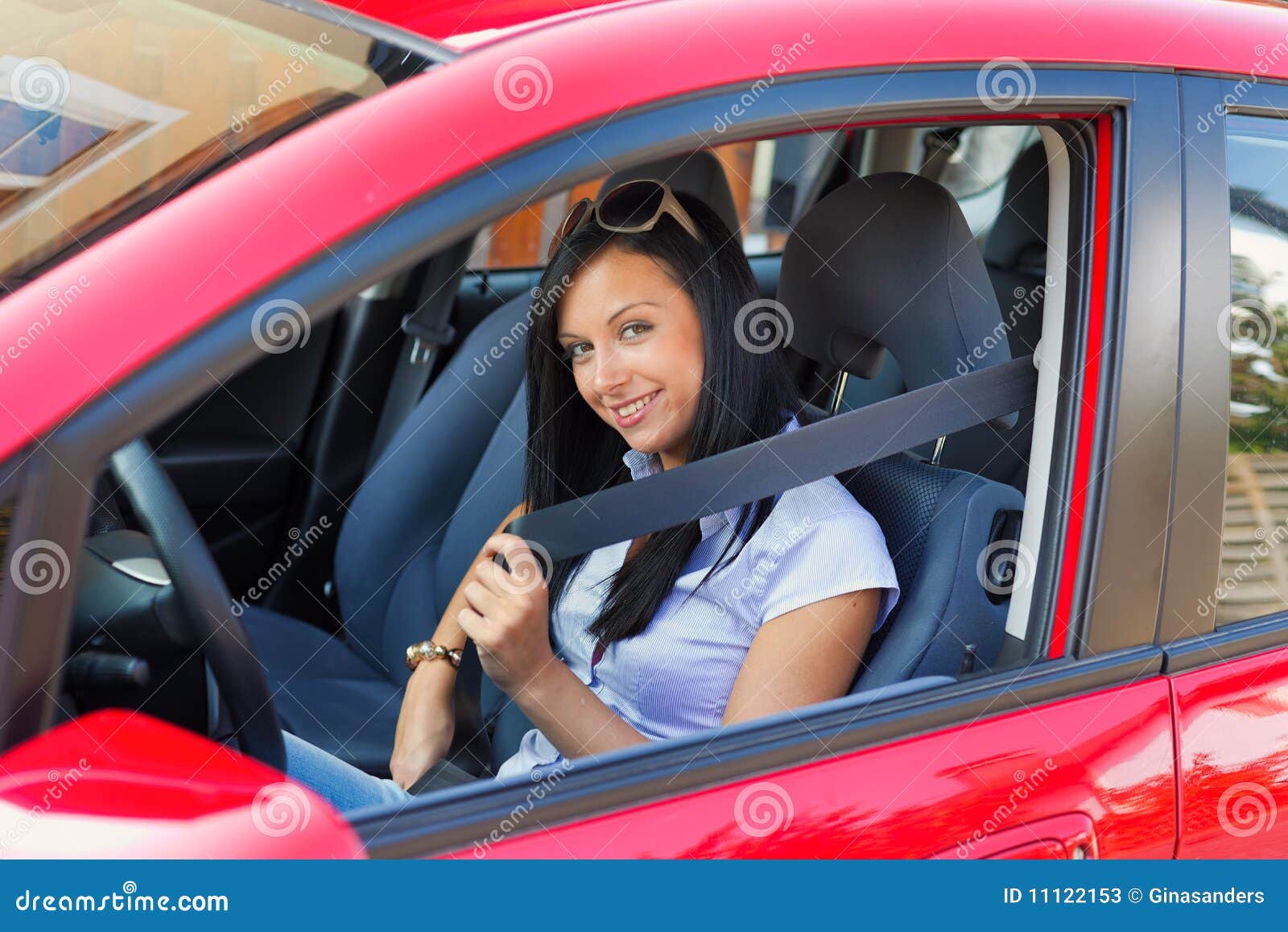 Frau Mit Einem Sicherheitsgurt In Einem Auto Stockbild Bild Von